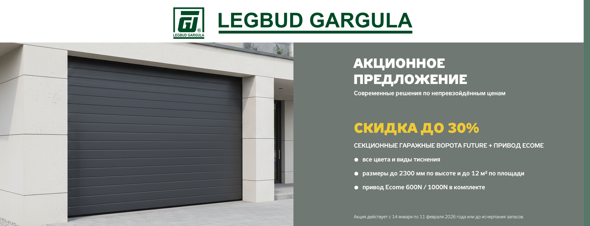 Рады сообщить, что теперь у вас есть доступ к нашему интернет-магазину с продукцией LEGBUD GARGULA. Мы предлагаем подъемно-поворотные и секционные гаражные ворота с доставкой клиенту, а также запасные части и комплектующие для ворот.