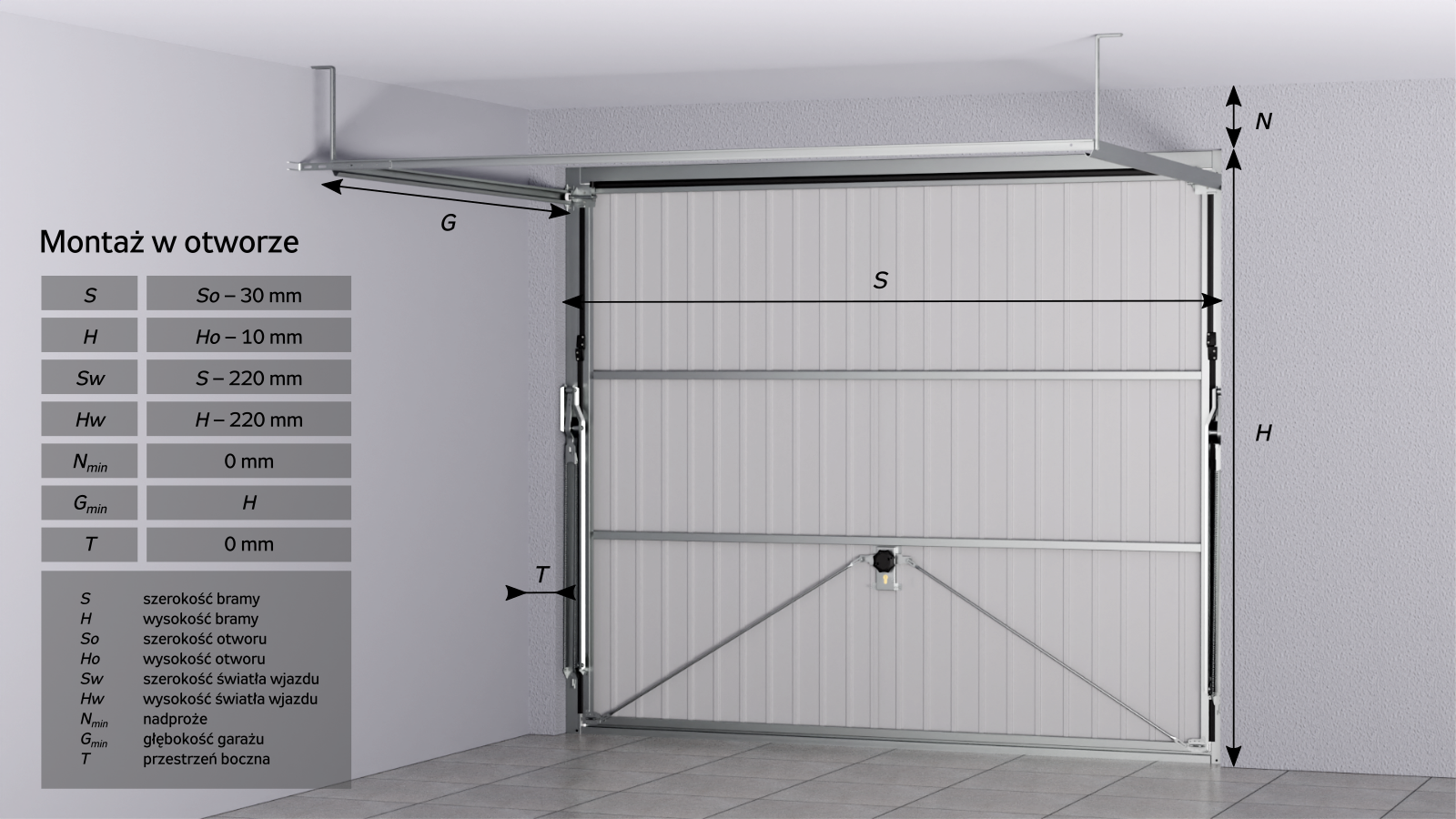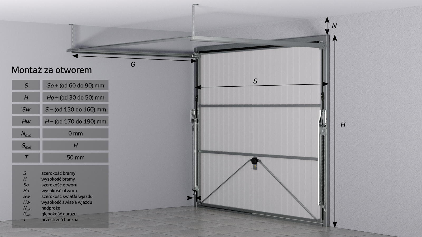 Przy wyborze rozmiaru bramy poza dopasowaniem do otworu należy uwzględnić sposób montażu. Brama uchylna może zostać zamontowana zarówno w świetle otworu, jak i za otworem na murze. Poniżej prezentujemy wymiary montażowe ułatwiające dobór właściwego rozmiaru bramy uchylnej.